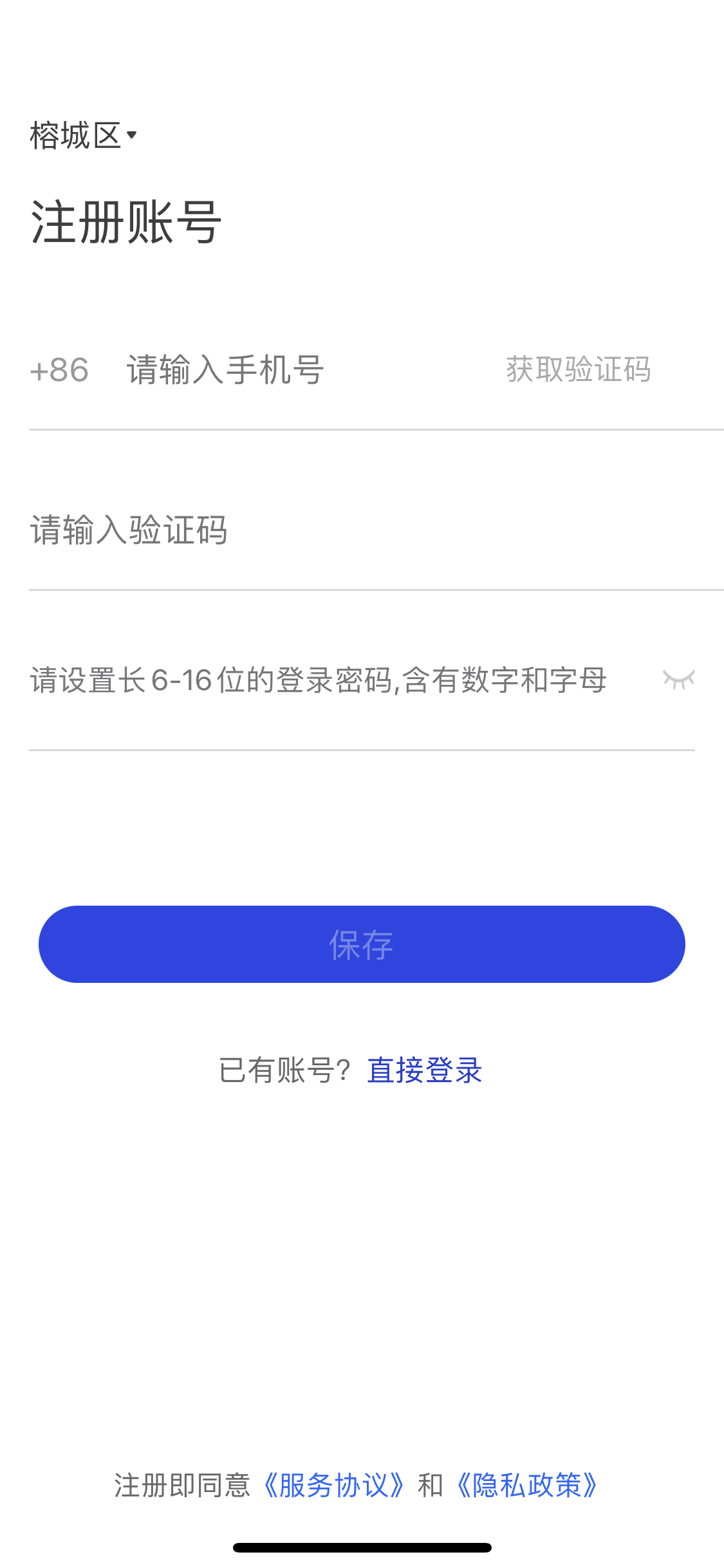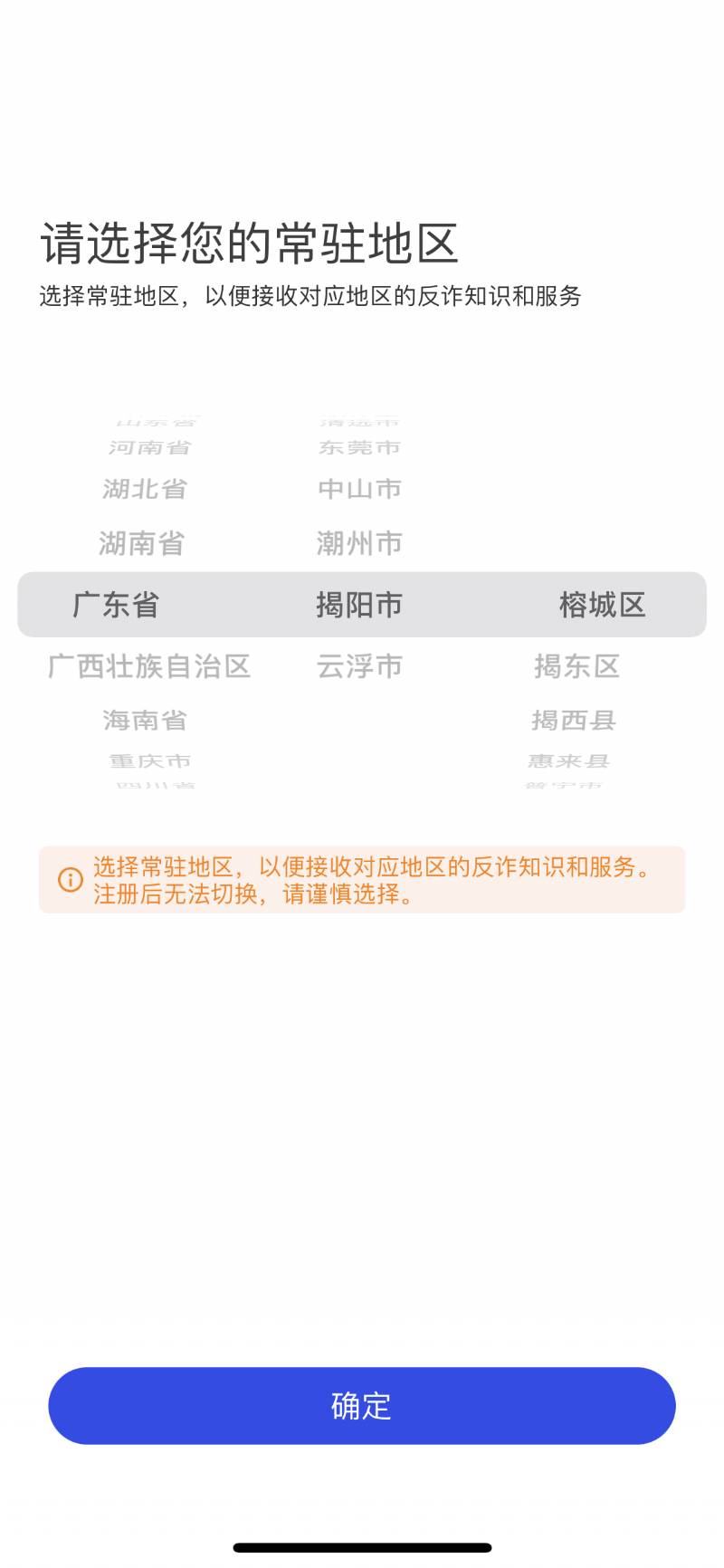 2、進(jìn)入APP后,首先選擇常駐地區(qū)完成注冊(cè),然后進(jìn)入登錄頁(yè)面,點(diǎn)擊“快速注冊(cè)”。完善個(gè)人賬號(hào)信息后并保存。